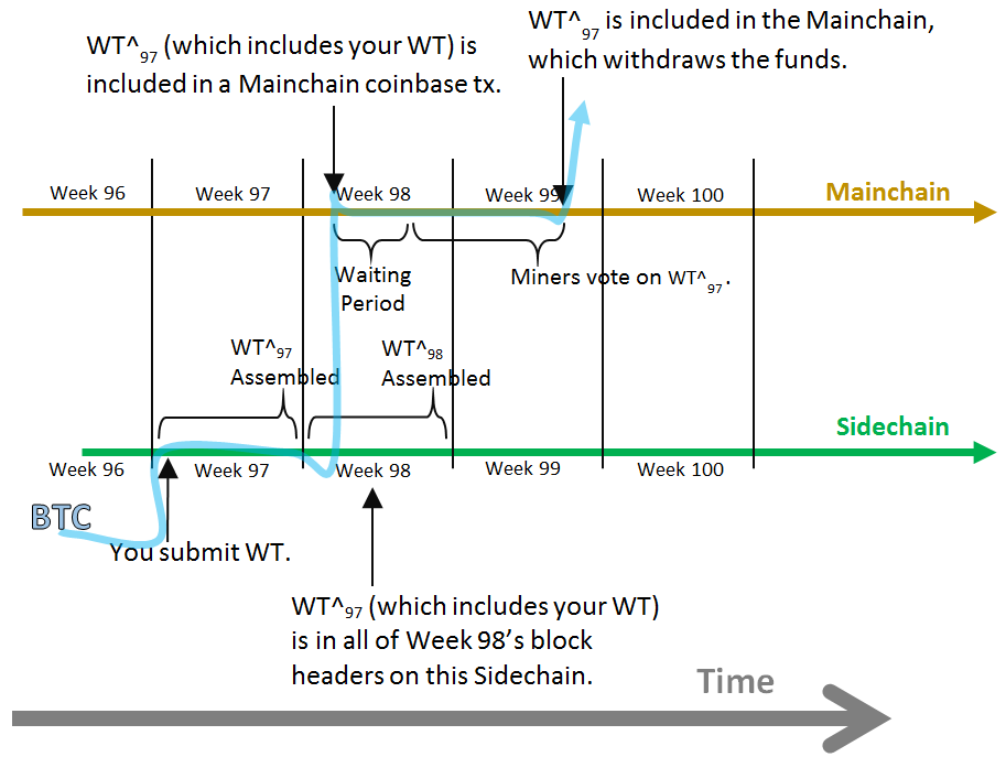 - Over time, these WTs accumulate on the sidechain. After enough time has passed, these WTs are bundled (coinjoin style) into a single large “WT^” which would pay “from” the mainchain “lockbox address” (it would reference the txns which sent their coins to the lockbox) to each mainchain withdrawal address. At this time, the (mainchain-compatible) transaction ID of WT^ is included in the sidechain’s block header.